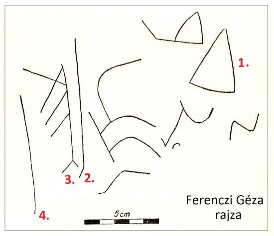 Véleményemhez Ferenczi Géza rajzát használom, amelyet én számoztam be. A 1-es betű a homoródkarácsonyfalvi G. (Ráduly szerint K). A 2-es SZ vagy I. Fényképemen inkább I-nek látszik. A 3-as egyértelműen P. A 4-es SZ. Jó érvekkel alátámasztott szöveges megfejtést egyelőre nem tudok adni. Legfeljebb, ha a 2-es SZ, akkor a 3-as P-vel adódik a SZéP szó.