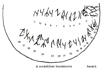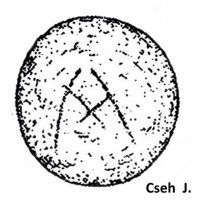 Cseh János régész írásában, melynek címe: Szkíta földművelők-állattartók településeinek régészeti nyomai a Zagyva mentén, fedeztem fel egy edény talpán a rajzot a Kr. e. V-VI. századból. Talp-átmérője 5-5, 5 cm. A szerző nem utal a talpon lévő karcolatra. Ez véleményem szerint összerovás, S, A és B rovásjelek alkotják. A hangértékeket alátámasztja, hogy belőlük magyar szavak fejthetők meg, többek között az ABA, SABA, BeSe, ez utóbbi ragadozó madarat jelent, később a besenyők törzsét is. /2. ábra/