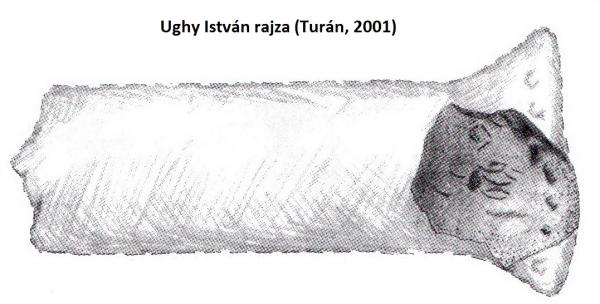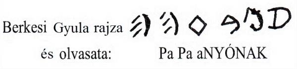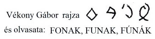 Vékony Gábor régész, nyelvész csupán négy jelet ítél rovásbetűnek. Megfejtése: FÚNÁK, azaz fúnék, fújtatnék.