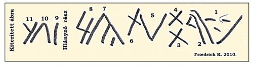 Az ezen lévő karcolt jelekből két rövid magyar szó is kiolvasható: pl. a 10, 11: EST vagy EST(e), 8, 7: ÜL