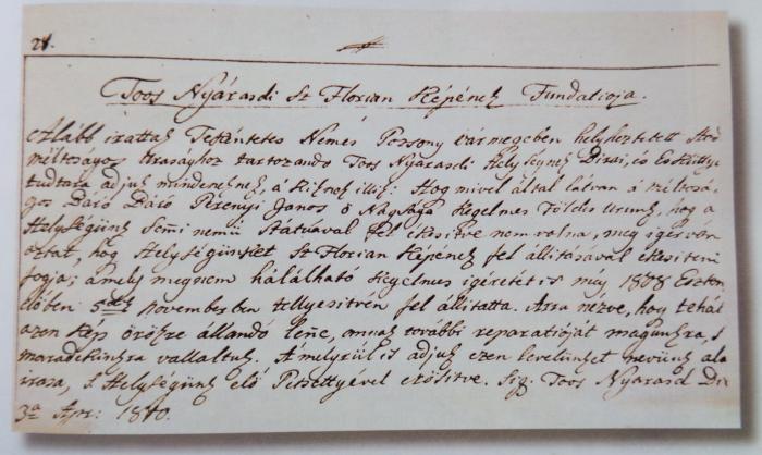 A mai Tósnyárasd egyik szimbólumának számító Szent Flórián 1808-tól dísze a községnek. Keletkezéséről fennmaradt egy 1810. április 3-én kiadott Toos Nyárasdi Sz. Florián Fundatioja cím alatti okirat. Ebben többek között a település bírója és esküdtjei megállapítják, hogy: Mivel látván méltóságos báró Perényi János ő nagysága kegyelmes földesurunk, hogy helységünk semminemű statuával felékesítve nem volna megígérvén aztat, hogy helységünket Sz. Florián képének felállításával ékesíteni fogja, amely megsem hálálható kegyelmes ígéretét még 1808-esztendőben 5 -dik novemberben teljesítvén. Arra nézve, hogy tehát azon kép örökre állandó lenne, annak további reporatióját magunkra és maradékainkra vállaltuk.