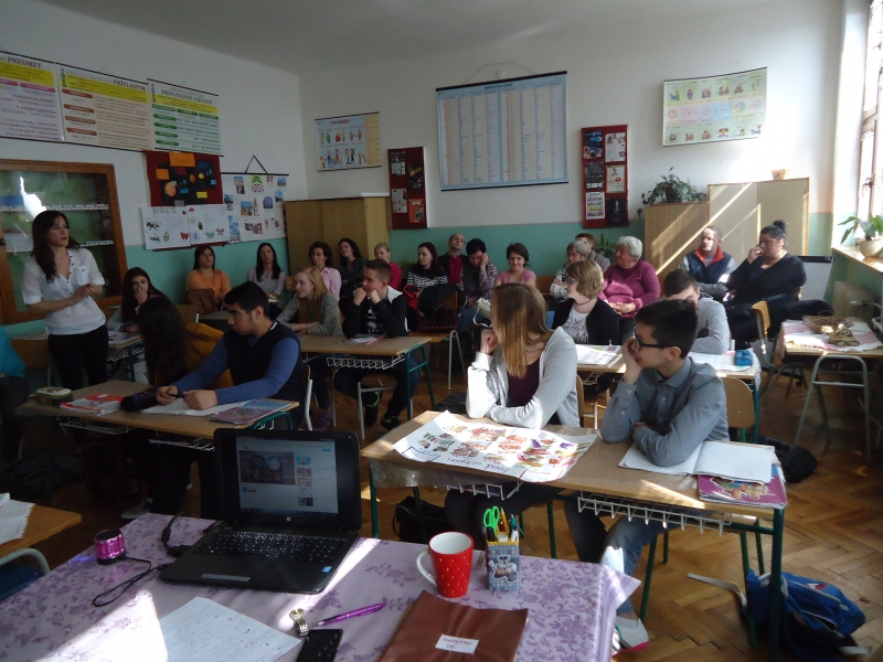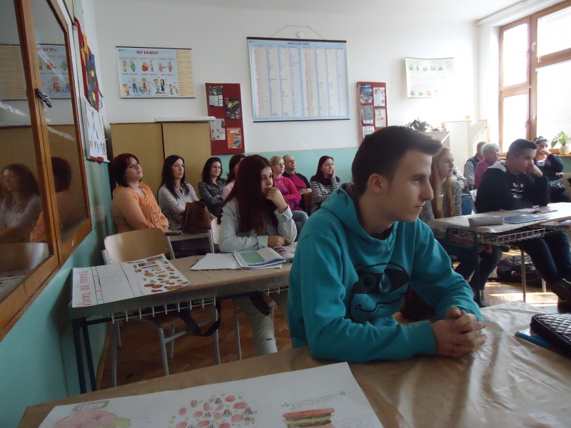 A második bemutatóóra a felső tagozaton, a VIII. osztályban volt. Sok szülő és nagyszülő élt a lehetőséggel, hogy megtekintse az angol órát Darázs Éva tanító néni vezetésével. A diákok izgatottan várták, hogy a nagyvilág elé tárják, mi mindent tudnak angolul. Az óra keretén belül bemutatták, mit tanultak az ételekről és az egészséges étkezésről. Átismételték az élelmiszer kategóriákat, majd egy videó következett, amellyel összehasonlították az ebédeket a világ különböző országaiban. Végül a projektek bemutatására is sor került. Az órát kis játékkal zárták a táblánál, hogy a szókincset is átismételjék. A hangulat egy kis humorral fűszerezve hamar feloldódott, mindenki nagyon jól érezte magát.