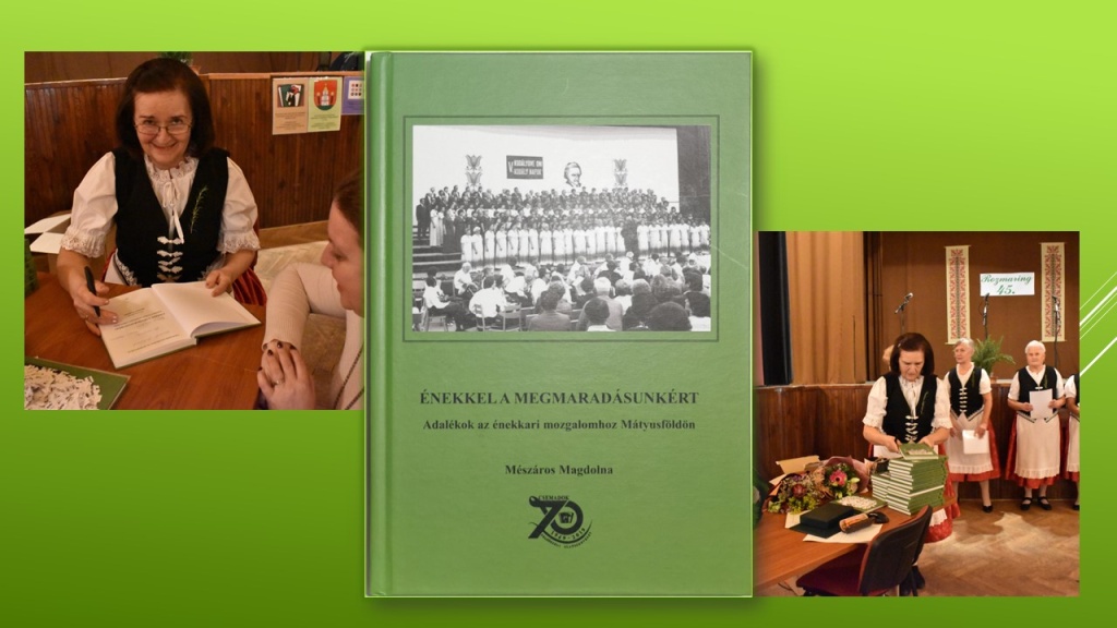 A 45 év tapasztalatai, emlékei kézzel fogható módon egy kötetbe kerültek, hogy akinek jelent valamit az éneklés, az szívesen forgatja majd. Mészáros Magdolna Énekkel a megmaradásunkért című kötetét vetített képes bemutatóval kínálta a közönségnek a jubileum kapcsán. A régió énekkari mozgalma történetének egy kis szeletét tartalmazza könyv. Az alcím - Adalékok az énekkari mozgalomhoz a Mátyusföldön arra utal, hogy nem teljeskörű átfogó műről van szó, csupán adalékokról, melyekben főleg a felsőszeli Rozmaring énekkar eddigi tevékenységét ecseteli. A Csemadok Felsőszeli Alapszervezete mellett működő énekkar már 45 éve hirdeti Sütő András szavait: „Amíg egy nép énekel, messzire hallatszik, hogy létezik.”