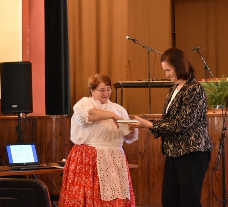A gratulációkhoz csatlakozott Görföl Jenő, a Csemadok OT titkára, aki átadta a karvezetőnek a Díszoklevelet, melyben a Csemadok Érdemes Művészei Csoportja címet adományozta a felsőszeli Rozmaring éneklőcsoportnak.