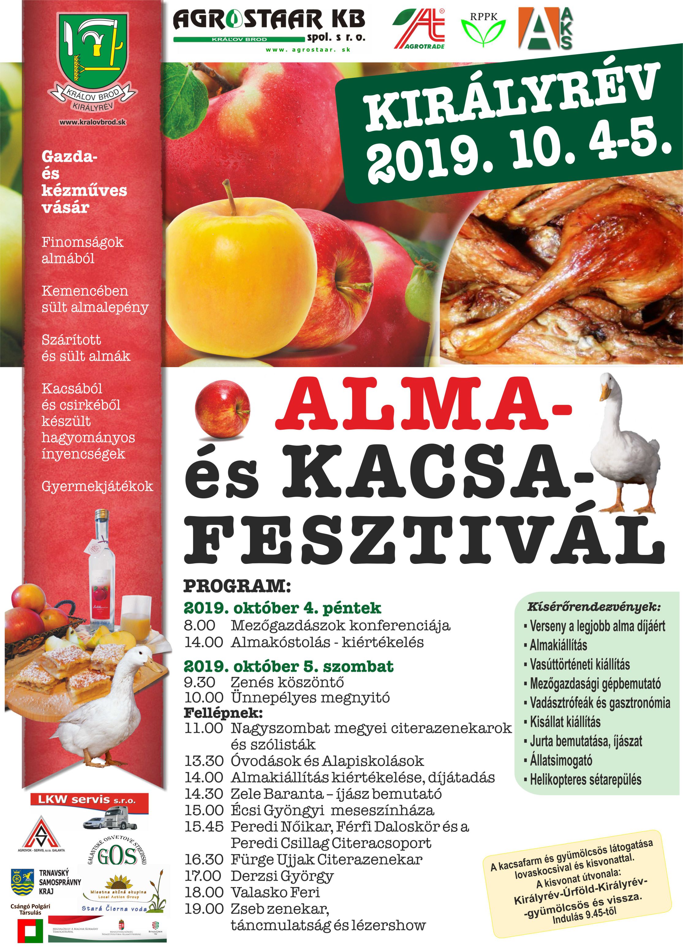 Már a kezdet kezdetén azt a célt tűztük ki, hogy ezen a rendezvényen minden az almáról, a hazai gyümölcsről, és általában a hazai termékekről szóljon. Nem gondoltuk, hogy ez az Almafesztivál ilyen jó visszhangra talál Királyrévben, és a sikeren fölbuzdulva próbáltuk a következő éveken is tovább gazdagítani a fesztivált. Mivel Királyrévnek második jellegzetessége a kacsa- és a csirketenyésztés, ezért a Fesztivált az alma ételeken kívül finom kacsasültekkel bővítettük. Az évek múlásával az Alma- és Kacsafesztivált tovább bővíttettük, mégpedig a régiónkban termesztett almák versenyével. Erre a versenyre, amit a Galántai Mezőgazdasági és Élelmiszer-ipari Kamara segítségével szervezünk, sok érdeklődő termelő jelentkezett, s a díjak mellett nagy szakmai elismerésben is részesülnek az egyes almatermesztők.