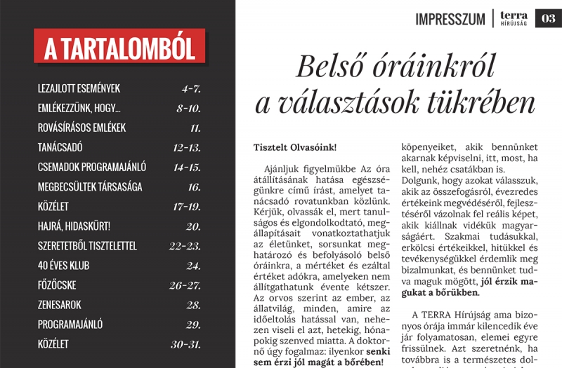 A tanácsadó rovatban az orvos az óraátállítás egészségügyi vonatkozásairól ír, a jogász a koncessziós díj elelévüléséről tájékoztat.