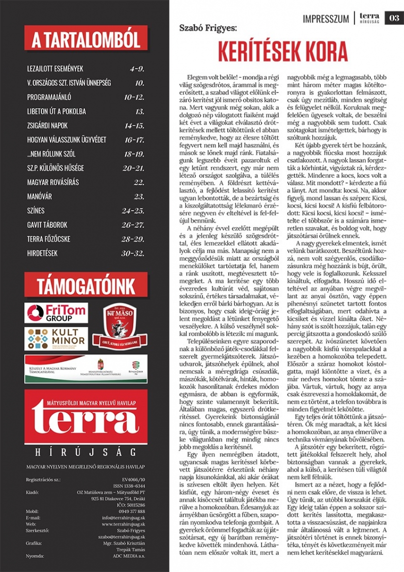 Az újság képes beszámolók sorát közli sikeres nyári rendezvényekről – a Nemeskajali Falunapról, a Megbecsültek Társasága kirándulásáról, a Csemadok Mátyusföldi juniálisáról, a XV. Nagyfödémesi Mátyusföldi Fesztiválról, a Bográcsban főtt ételek deáki versenyéről, illetve a régió idei legnagyobb kulturális-közösségi eseményéről, a Királyrévben megrendezett kétnapos Révfeszt zenei fesztiválról.