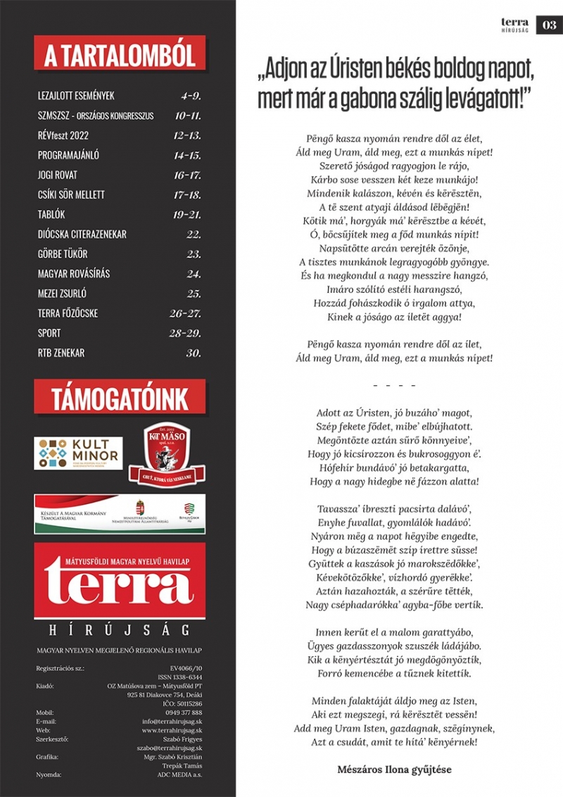 Készülő mátyusföldi nyári rendezvények ismertetésével a címlapján jelent meg a havilap július első napjaiban. A zsigárdi tánc- és verstábor, a királyrévi RÉVfeszt zenei fesztivál és a kismácsédi Parasztolimpia részletes műsorát a Programajánlóban találják.