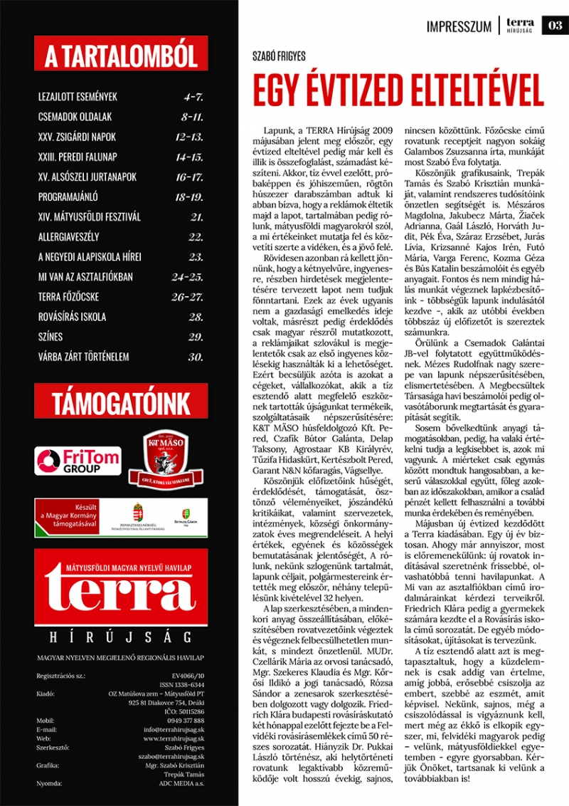 A Terra Főzőcskében finom ételek receptjeit, a Zenesarok rovatban több érdekes írást, a gyermekoldalon pedig Friedrich Klára rovásíráskutató Rovásírásiskola című sorozatának 2. részét találjuk.