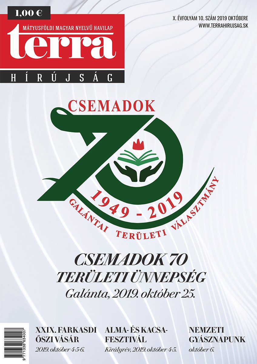 A Csemadok galántai területi ünnepségének logójával a címlapján jelent meg a mátyusföldi havilap októberi száma. A 70. évforduló kapcsán Hrubík Béla, a Csemadok volt országos elnöke írását olvashatjuk, a Csemadok mellékletben pedig az elmúlt fél évtized tevékenységéről találunk képes összefoglalót. Emellett az elmúlt öt év díjazottjainak arcképcsarnokát, valamint a 2020-as évben megvalósuló országos, területi és járási Csemadok-rendezvények tervét is közli a lap.
