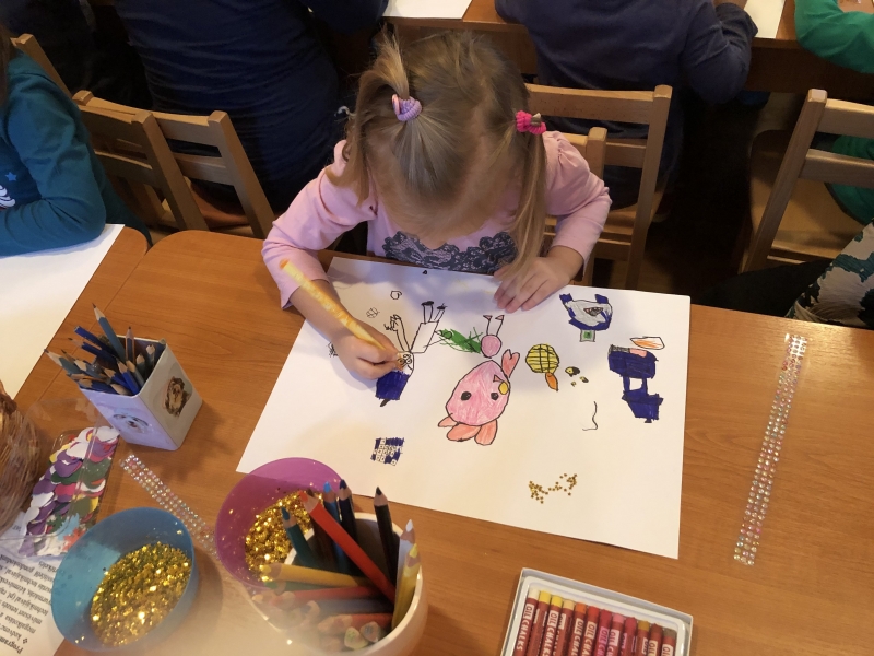 A Rákóczi Hálózat támogatásából rajzeszközöket – színes ceruzákat, olajpasztelleket, zsírkrétákat, filctollakat, különböző díszítő elemeket, színes papírt, szalagokat, ragasztókat vásároltunk. Ezen kellékek felhasználásával az óvodások és az elsősök tetszés szerinti képzőművészeti technikával dolgoztak, megrajzolták kedvenc népmeséjüket. Néhány gyermek a „Szép Cerceruska“, néhányan a „Kiskakas gyémánt félkrajcárja“, mások a „Csillagszemű juhász“ és más népmesét választottak. A képzőművészeti alkotások elkészítése után vendégség - gyümölcstálak, gyümölcslé várta a gyermekeket és pedagógusokat, majd önfeledt közös játékkal fejeződött be az együtt töltött tartalmas délelőtt.