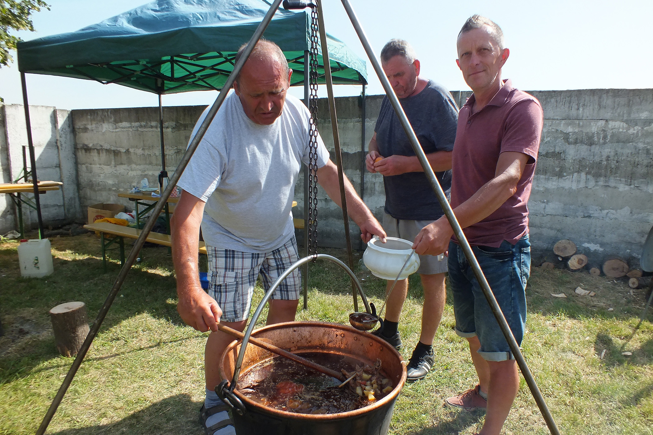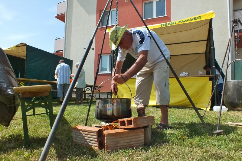 A helyi kultúrház udvarán a már kora délelőtt is hétágra sütő nap alatt sorra gyúltak a tüzek a bográcsok és rézüstök alatt vagy a katlanokban. Nemsokára rotyogott a lében a hús, némelyikben disznó, némelyikben marha, vagy éppen őz, de akadt pacalpörkölt is. Mint mindig, most is a Kiskertészek Szövetségének Deáki Alapszervezete volt a főszervező, persze ezúttal is a községi önkormányzat támogatásával. A versenybe ezúttal 13 csapat nevezett be. Nemzetközi részvételű versenyről beszélhetünk, hiszen már hagyományosan itt voltak a magyarországi testvértelepülés, Kakasd képviselői és egy cseh társaság, a miloticei tűzoltótestület csapata, amelynek egyik tagja rokoni szálakkal kötődik Deákihoz. Igaz, a kakasdiakat ezúttal csak a benevezettek között jegyezték, mivel bizonyos utazási nehézségek miatt későn érkeztek, így a kiértékelésig nem tudták megfőzni a gulyásukat, de később befejezték azt, és versenyen kívüli résztvevőként vehettek át elismerő oklevelet Jakócs Krisztina polgármestertől és Szabó Györgytől, a helyi kiskertészek elnökétől. A versenyben szervezetek, baráti társaságok vagy családok csapatai vetélkedtek. A díjazottak sorrendjét szokás szerint az egyes főzőcsapatok egy-egy képviselőjéből összeállt zsűri által odaítélt pontszámok határozták meg. Legalább az első öt helyezettet név szerint is említsük meg: 1. Doki trió meg én, 2. deáki kiskertészek, 3. Buki Peti és csapata, 4. Fakanálforgatók, 5. A helyi Csemadok csapata.