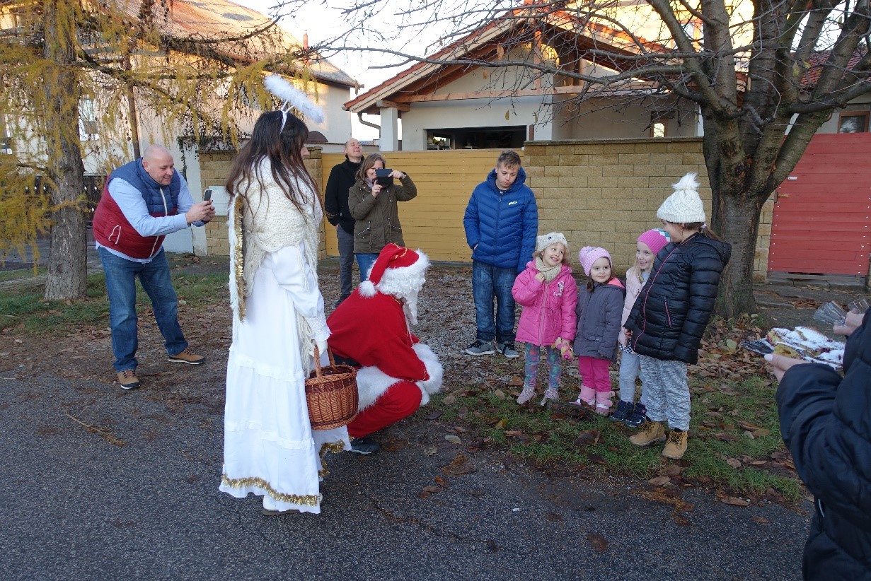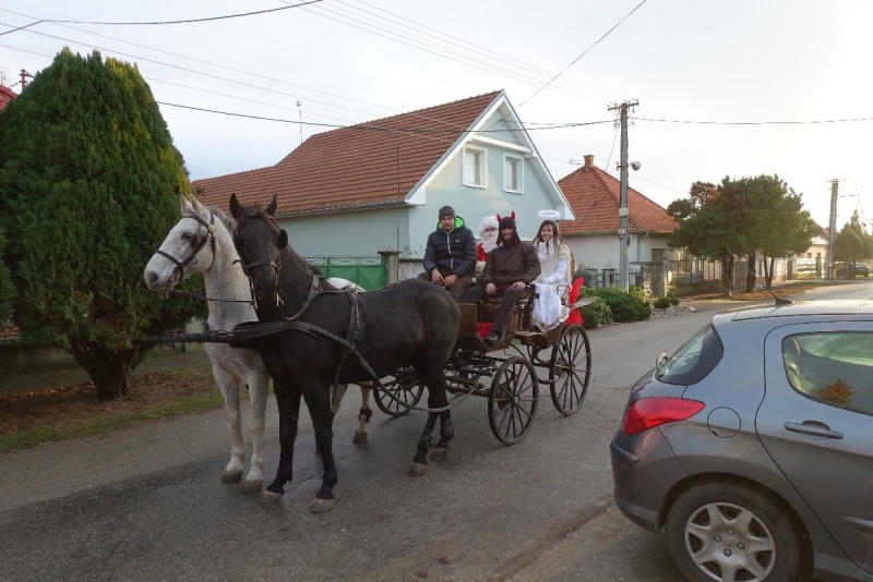 Nem is egyedül, hiszen Angyalka és a Krampusz is elkísérte, amikor falunkba látogatott, december első szombatján. Minden utcát bejárt, és minden gyereket megajándékozott, akit az utcán talált.