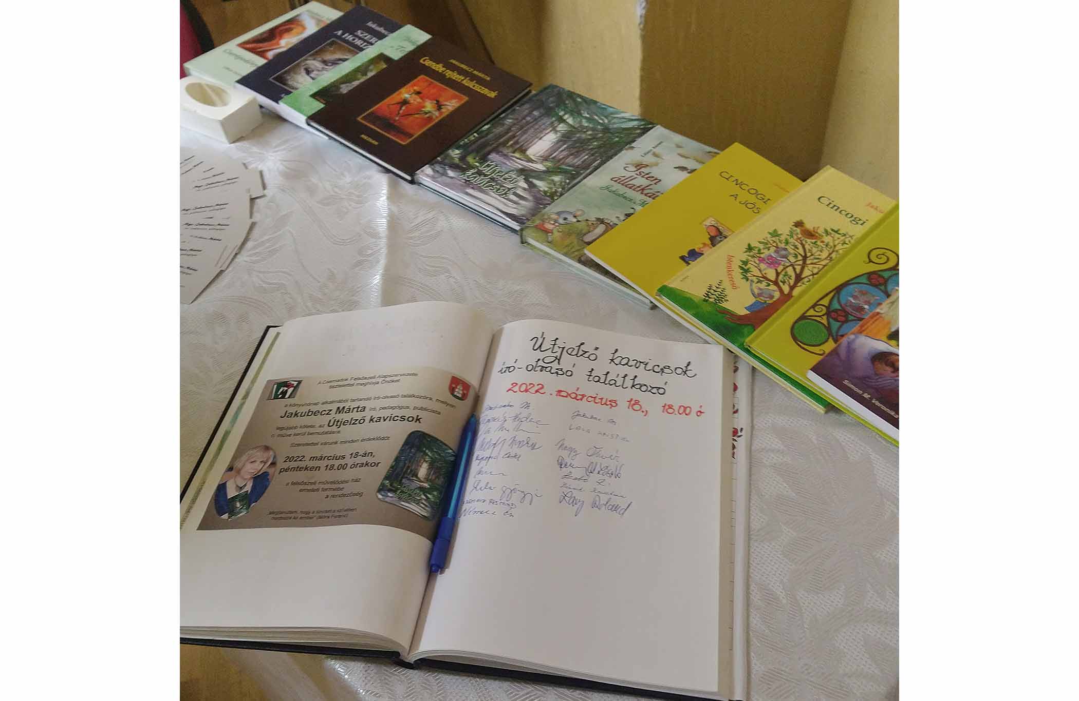Tizedik kötete, az Útjelző kavicsok az írói jubileum 10. darabja. Az olvasók kíváncsiságának engedve végül Jakubecz Márta őszinte szavakkal elmesélte legújabb műve születését. A bemutató során a kötetből idézeteket olvasott fel Szalai Gyöngyike, melyek érzékeltették az írónő szavait. Ezután a szervezők részéről Végh Piroska alelnök megköszönte a tartalmas összefoglalót, s virágcsokorral gratulált a szerzőnek, Jakubecz Mártának. A közönség pedig dedikáltatta az új kötetet, melyet még remélhetőleg továbbiak fognak követni.