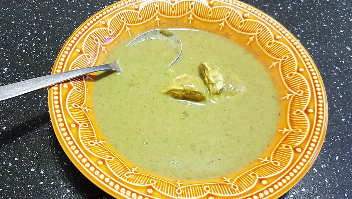 Hozzávalók: Egy kocka fagyasztott spenót, 1 tejföl, 1 db vöröshagyma, pár szem fokhagyma, fehérbors, 2 db leveskocka, szerecsendió, fejenként egy tojás.