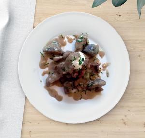 Elkészítése: A húst megpirítjuk, hozzáadjuk a felkockázott vöröshagymát és a gombát a levével együtt, ha befőzöttet használunk. Felöntjük, sózzuk, borsozzuk. Fedő alatt puhára főzzük. A végén hozzáadjuk a kis kockákra vágott csemege uborkát. Tejszínnel, vagy tejföllel sűrítjük, amelybe belekeverünk egy kevés lisztet. Beforraljuk.