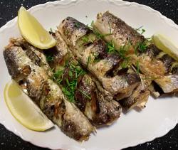 Elkészítése: A haltörzseket szépen megmosogatjuk, éles késsel vagy ollóval eltávolítjuk az uszonyokat. Mindkét oldalon beirdaljuk, tehát a gerincükig többször mélyen bevágjuk. Sózzuk és megszórjuk halfűszerrel. Egy tálba elkeverjük a puha vajat, az összezúzott fokhagymát, szárított kaprot, majd a keveréket beletömködjük a bevágásokba. Ha marad, a halakat is bekenjük vele. Olajjal vékonyan kikent tepsibe szépen lerakjuk a halacskákat, és 180 fokon szép barnás-pirosra sütjük.