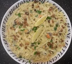 Hozzávalók: 1 csomag spagetti vagy linguine tészta, 1 csomag fagyasztott tenger gyümölcsei (300 dkg), minden szupermarketben kapható. Egy doboz tejszín, 1 darab ömlesztett sajt, mondjuk Karička, egy közepes hagyma, 5 gerezd fokhagyma. 15 dkg szalonna, só, bors és 3 teáskanál pesto.