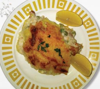 Elkészítése: Egy palacsintasütőben kevés olajon megsütjük a felkockázott szalonnát, ha félig kész rádobjuk a felkarikázott póréhagymát. Félretesszük. Fogunk egy lábast és egy jó nagy adag vajban kb. 4-5 evőkanál lisztet kevergetve -, hogy meg ne égjen- kicsit megkapatunk. Fogjuk a habverőt és állandó keverés mellett felönjük a tejjel, tehát besamelt készítünk. Kevergetve hagyjuk sűrűsödni, majd jöhet a tejszín, a zöldborsó, a póréhagymás szalonna, és a falatnyi kockákra vágott hal. Pár percig óvatosan kevergetve főzzük. Sem a halnak, sem a cukiborsónak nem kell sok idő. Lekapcsoljuk a lángot, sózzuk, borsozzuk kicsit markánsabban mint egyébként, és egy kiskanálnyi halfűszerrel ízesítjük. Én ilyenkor minden maradék sajtot is belekeverek, attól csak jobb lesz. Kikent tepsibe öntjük, hagyjuk kihűlni, majd a tetejére finom, ízes krumplipürét halmozunk. Megszórjuk reszelt sajttal, és forró sütőbe tolva, addig sütjük, míg a krumpli jó, ropogós lesz. Kb. 30 perc. Kaporral, vagy petrezselyemzölddel megszórva tálaljuk.