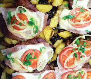 Elkészítése: A kiklopfolt húst befűszerezzük, megkenjük mustárral. Jó nagy serpenyőben mindkét felét pirosra sütjük, majd felöntjük kb. 2 deci vízzel és fedő alatt vajpuhára pároljuk. A krumplit és a zöldségeket nagyobb – emberes- darabokra vágjuk és megszórjuk sóval, borssal, 2 evőkanálnyi ketchuppal. Jól összekeverjük, és egy kikent tepsiben megsütjük. Amikor már majdnem kész, a tetejére rakjuk a hússzeleteket, amelyekre sonkát, sajtot, néhány karika paprikát, paradicsomot halmozunk, és néhány perc alatt készre sütjük. A pecsenye szaftját forraljuk be ribizlidzsem és mustár hozzáadásával, isteni szósz lesz belőle.