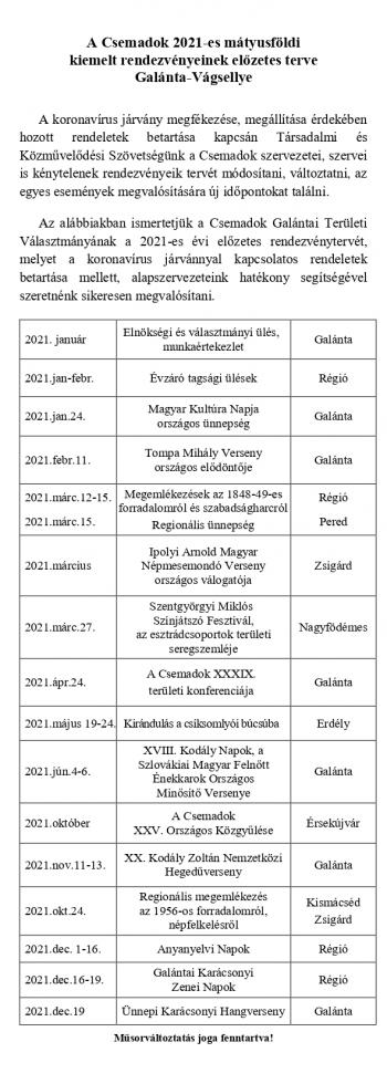 A rossz idők múltában bízva, amint azt a következő oldalon láthatják, elkészítettük a 2021-es rendezvényeink előzetes tervét annak reményében, hogy összefogva az egyes eseményeket sikerül megvalósítanunk, és már a magyar kultúra napi országos ünnepségen nagyszámú közönség előtt köszönthetjük régiónk országos kitüntetéseket átvevő Csemadok tagjait, a Csemadok Életmű Díjjal kitüntetett Suba Annát, Tornócról és a Csemadok Közművelődési Díját átvevő Morovics Ibolyát, Alsószeliből.