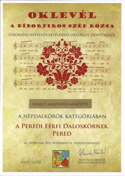 A november 23.-án Dunaszerdahelyen megrendezett országos döntőn a daloskör felelősségteljesen és összezártan lépett színpadra. Egymásra figyelve fegyelmezetten, összecsengve énekelt. A Peredi Férfi Daloskör produkcióját a zsűri a Népdalkörök kategóriájában nem csupán kiemelt aranysávos minősítésben részesítette, hanem tovább juttatta a 2020 novemberében Budapesten sorra kerülő Vas Lajos Népzenei Verseny Kárpát-medencei Döntőjébe.