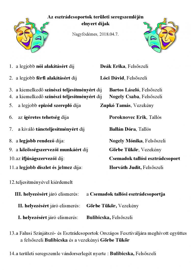 A remek hangulatú rendezvény a hazaiak Örökségünk című zenés lírai műsorával ért véget, s a szereplők azzal a reménnyel tértek haza, hogy jövőre huszadszor is találkoznak az immár Szentgyörgyi Miklós (a Pécsi Iparos Színkör színjátszóinak vezetője, aki hosszú évekig volt rendszeresen a rendezvény vendége, zsűritagja, s aki tavaly decemberben váratlanul hunyt el) nevét felvevő seregszemlén.